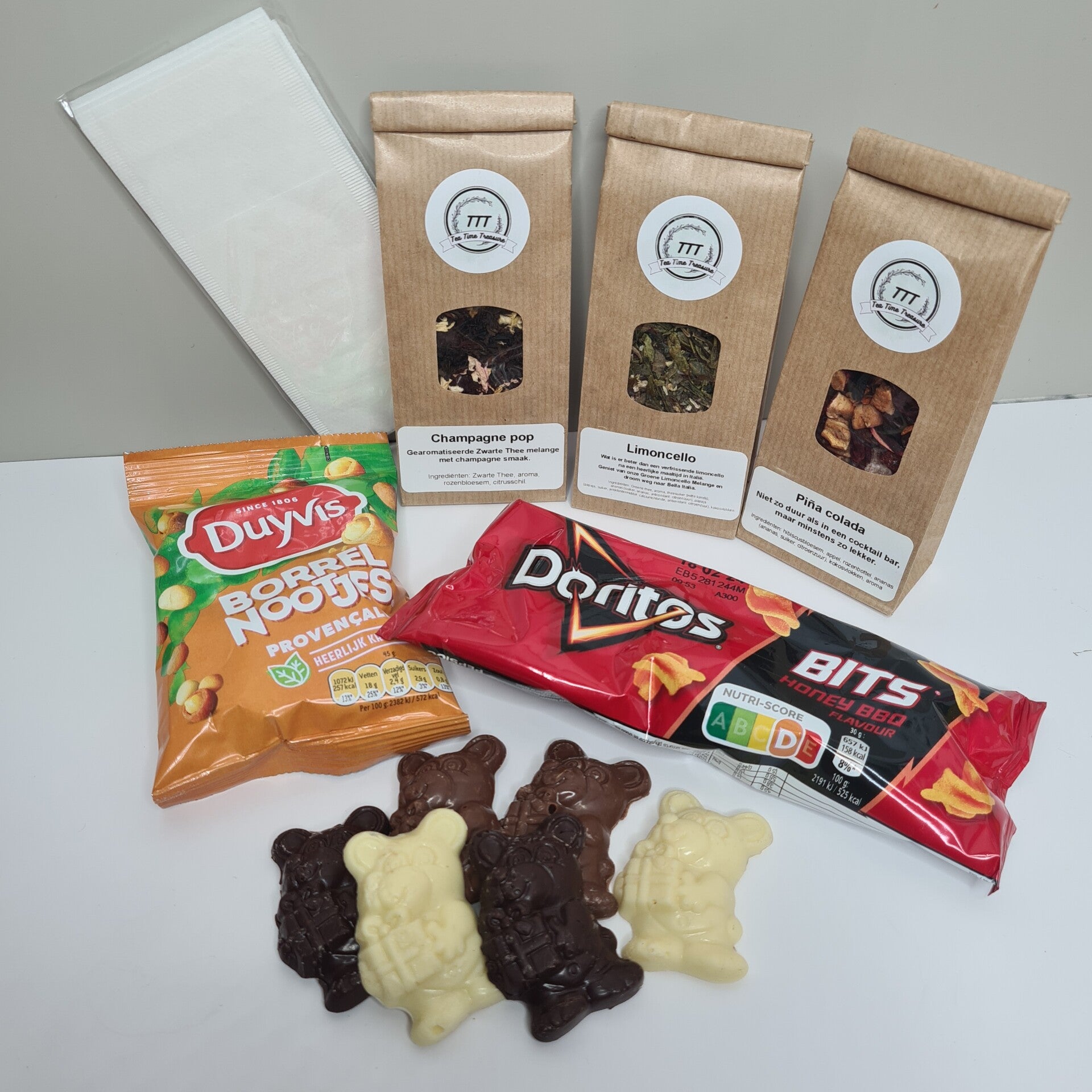 Breng de gezelligheid naar huis met ons Borrelpakket, een perfecte combinatie van heerlijke theeën en smakelijke lekkernijen. Ontdek de verfrissende smaken van onze 25 gram Limoncello thee, de tropische vibes van de Pina Colada en de sprankelende sensatie van Champagne Pop. Verwen je smaakpapillen verder met een assortiment knapperige nootjes, hartige Dorito bites en verrukkelijke chocolade. Of je nu een feestje viert met vrienden of gewoon ontspant na een lange dag, ons Borrelpakket zorgt gegarandeerd voor een gezellige en smaakvolle ervaring.