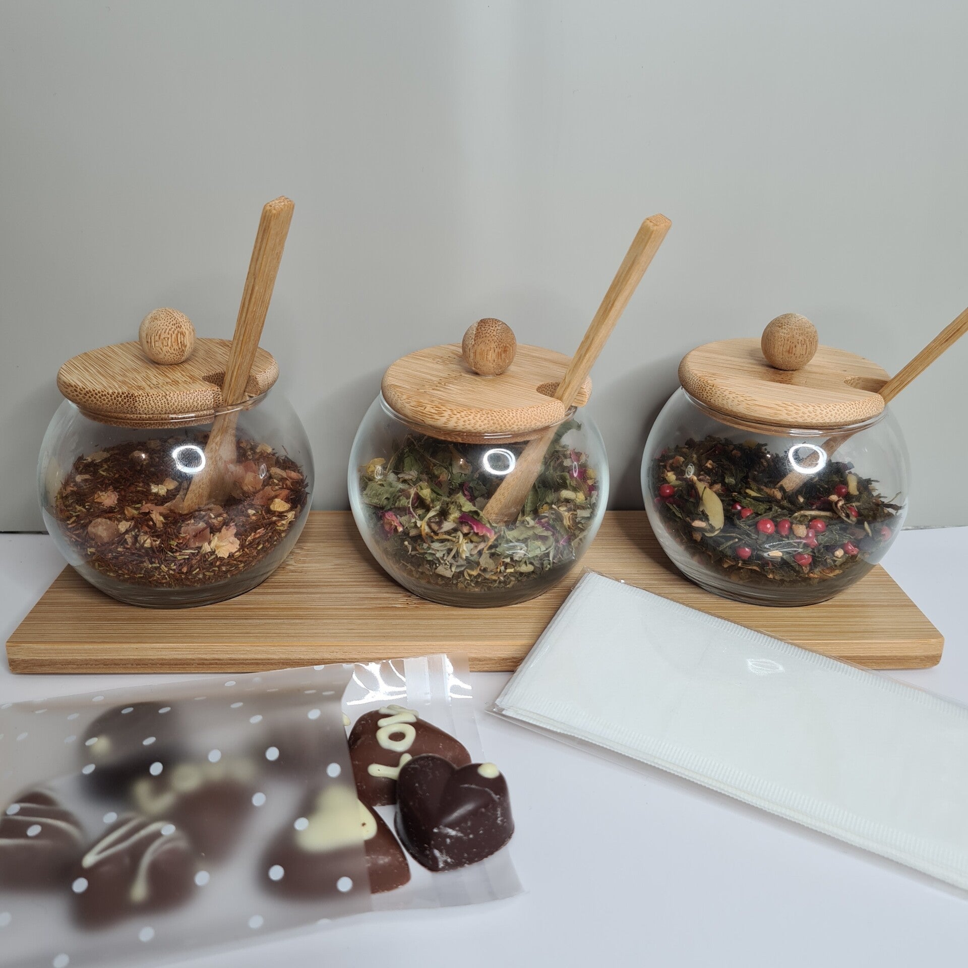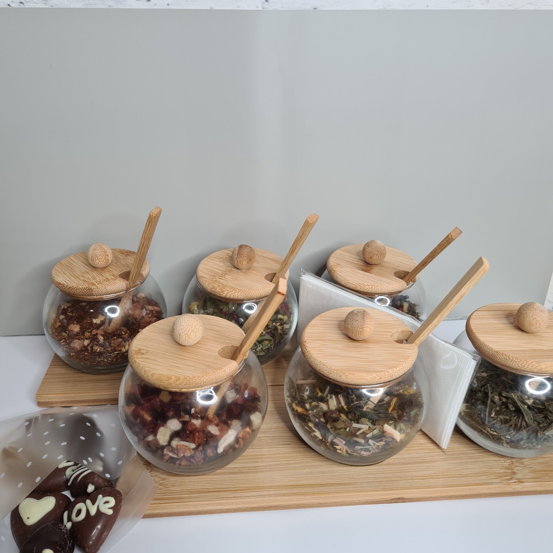 - Serveerset: Presenteer je thee in stijl met onze elegante serveerset, bestaande uit twee houders met 3 potjes die erop kunnen met bij gevoegde lepels.