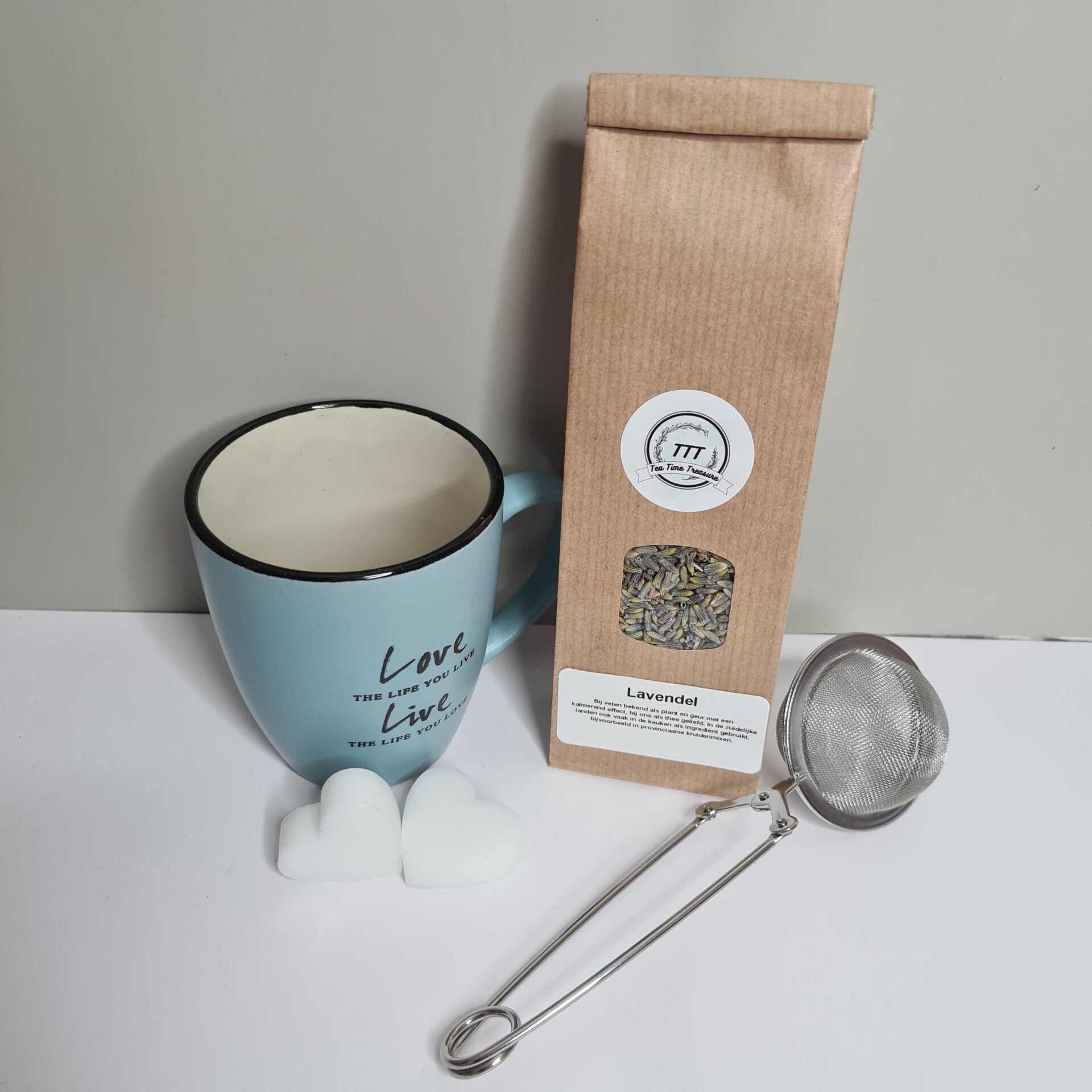Ontsnap aan de drukte van het dagelijks leven en omarm een gevoel van rust en ontspanning met ons Lavendel Pakket. Geniet van de kalmerende aroma's van onze 30 gram Lavendel thee, een delicate en rustgevende blend die je zintuigen omhult met zijn subtiel bloemige smaak. Bereid je thee moeiteloos met de bijgeleverde thee tang en ontspan je verder met onze heerlijk geurende lavendel zeepjes. Maak je ervaring compleet door je thee te serveren in onze prachtige beker, perfect voor een rustgevend moment voor jezelf.