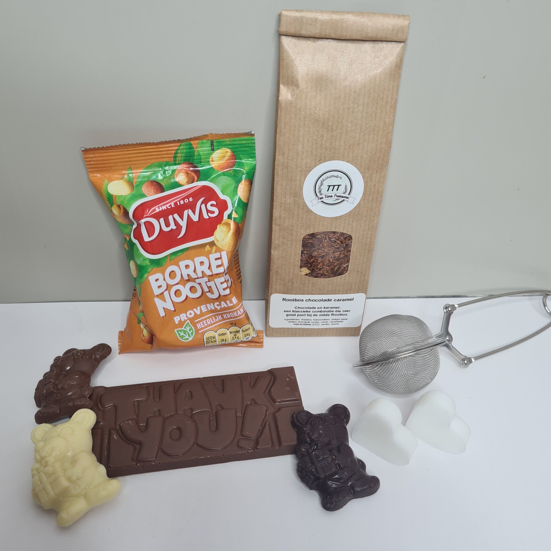 Laat je waardering zien met ons Bedankt Pakket, een warm gebaar van dankbaarheid gevuld met heerlijke lekkernijen en ontspannende verwennerijen. Verras je geliefde met onze Rooibos Chocolade Caramel-thee, een zalige en verwarmende blend die hun smaakpapillen streelt. Bereid de thee moeiteloos met onze handige thee tang en geniet van een knapperige snack met onze nootjes. Verwen ze verder met de kalmerende geur van lavendel met onze lavendel zeepjes, en laat hun smaakpapillen smelten met een heerlijke reep chocolade. Voeg een persoonlijke boodschap toe met onze optionele kaart, om je warme dankbaarheid en waardering te delen.