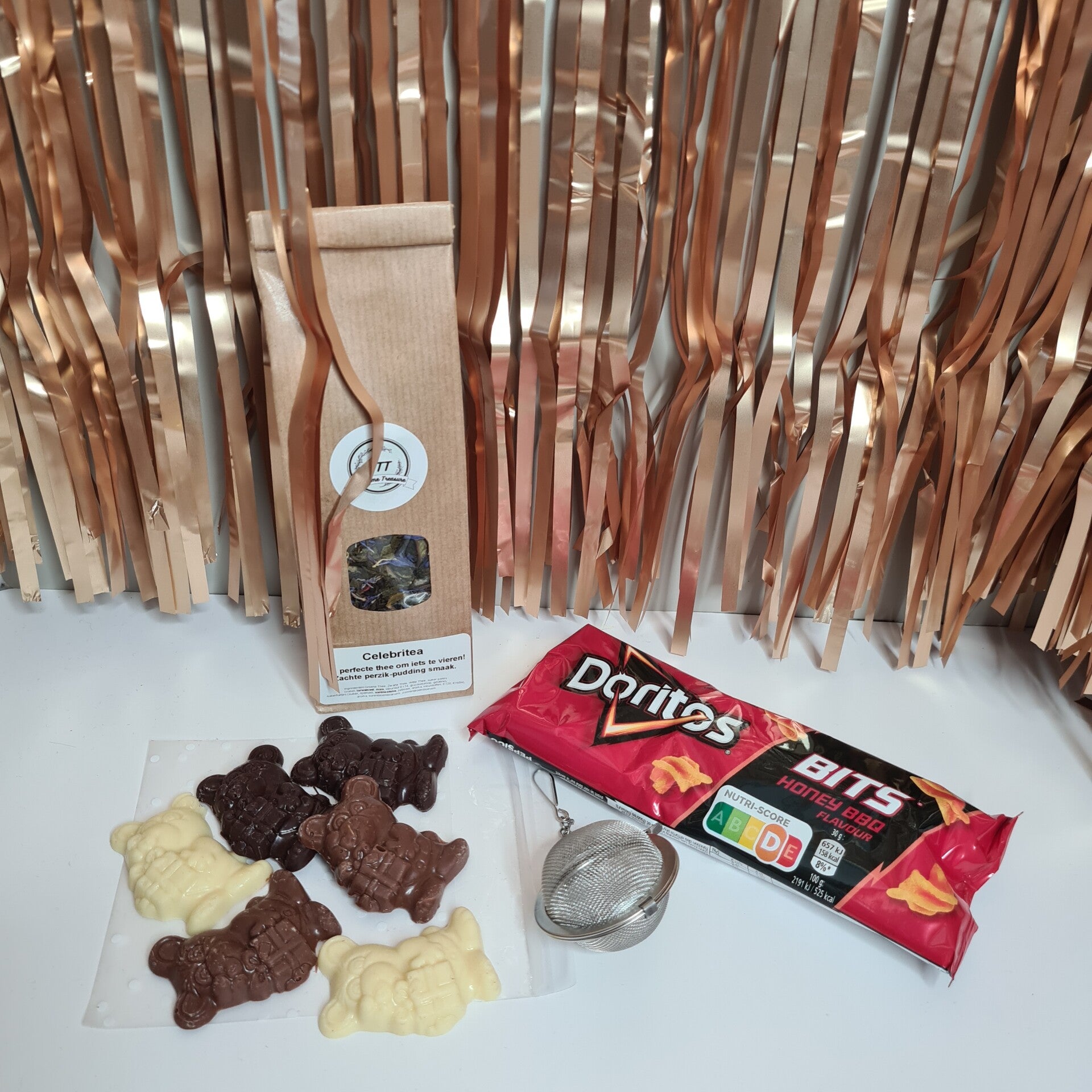 Dit pakket bevat: Celibritea (50gr), thee bal, chocolade, chips
