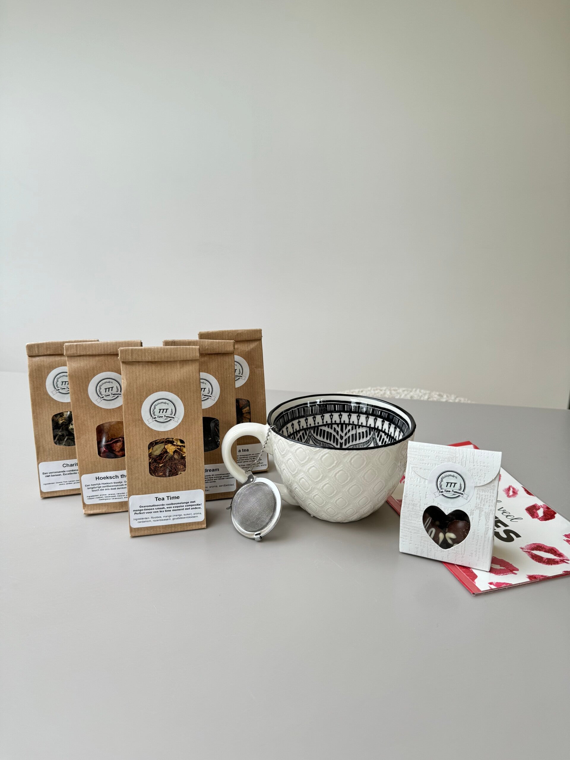 Verras jouw moeder met een onvergetelijke smaakbeleving met onze Moederdag Thee Proeverij, een assortiment samengesteld om haar te laten genieten van de verfijnde smaken en aroma's van vijf heerlijke theeën. Verpakt met liefde en zorg, dit pakket belooft haar een rustige en aromatische reis, vergezeld van een prachtige mok, een elegante thee bal en verrukkelijke chocolaatjes.